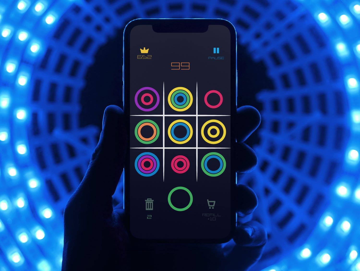 TIC TAC TOE游戏扭曲。匹配3个相同颜色的戒指来摧毁它们。